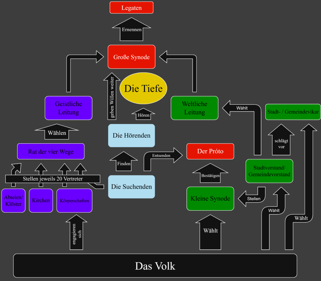 Das zentrale Machtorgan ist die Große Synode mit Sitz in Yurutron. Sie fungiert gleichzeitig als gesetzgebendes Parlament und oberstes Regierungsgremium. Die Synode besteht aus 20 Mitgliedern und ist streng paritätisch besetzt: