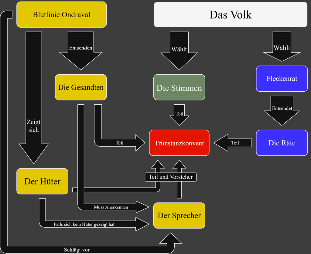 Die Gesandten werden von der Familienlinie des Hüters, dem Ondraval’schen Geschlecht, direkt ernannt und vertreten die Interessen der Krone innerhalb des Parlaments. Insgesamt werden fünf Personen gesandt. Die Gesandten werden nur neu nominiert, wenn einer oder mehrere der Gesandten zurücktritt oder stirbt. Im Konvent hat jeder einzelne dieser Gesandten eine Gewichtung von fünf Stimmrechten.